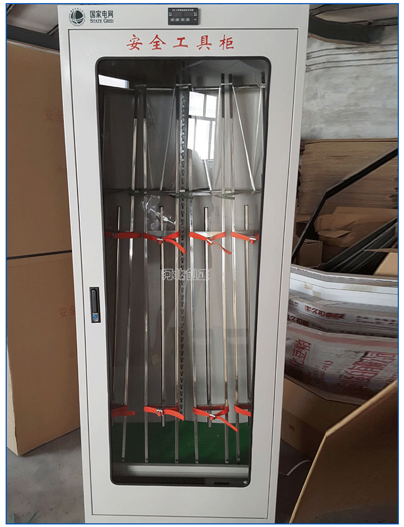 1、柜體是冷軋鋼板卷壓成型,厚度有1.0mm,1.2mm,1.5mm供選擇。柜體表面采用靜電防腐噴塑工藝,顏色為駝灰色,柜門裝有通體透明鋼化玻璃,透過玻璃可以看到分類有序的工器具。